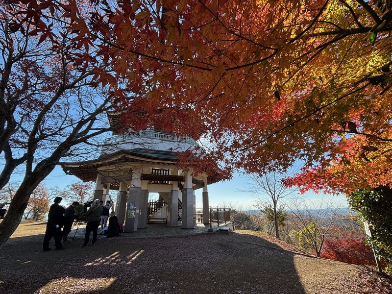 震生湖の紅葉はまだ見頃の状態が続いており、湖周辺の木々が赤や黄色に色づき、湖面に写る青空とともに、印・・・