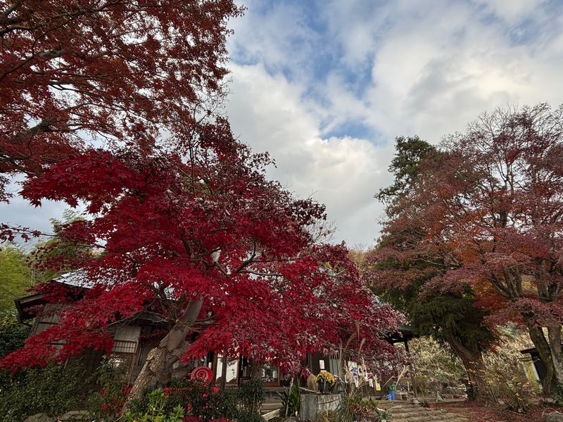 深い緑色の丹沢の山々を背景に、古民家と真っ赤に色づいた木々の組み合わせには、どこか郷愁が漂います。