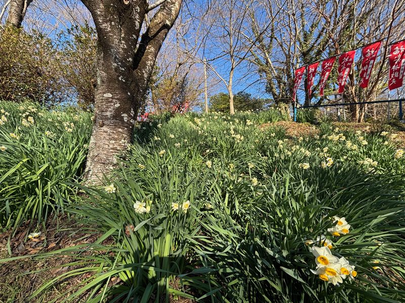 震生湖の湖畔、福寿弁財天の北側にある広場の斜面やその周辺で、スイセンが見頃を迎えています。