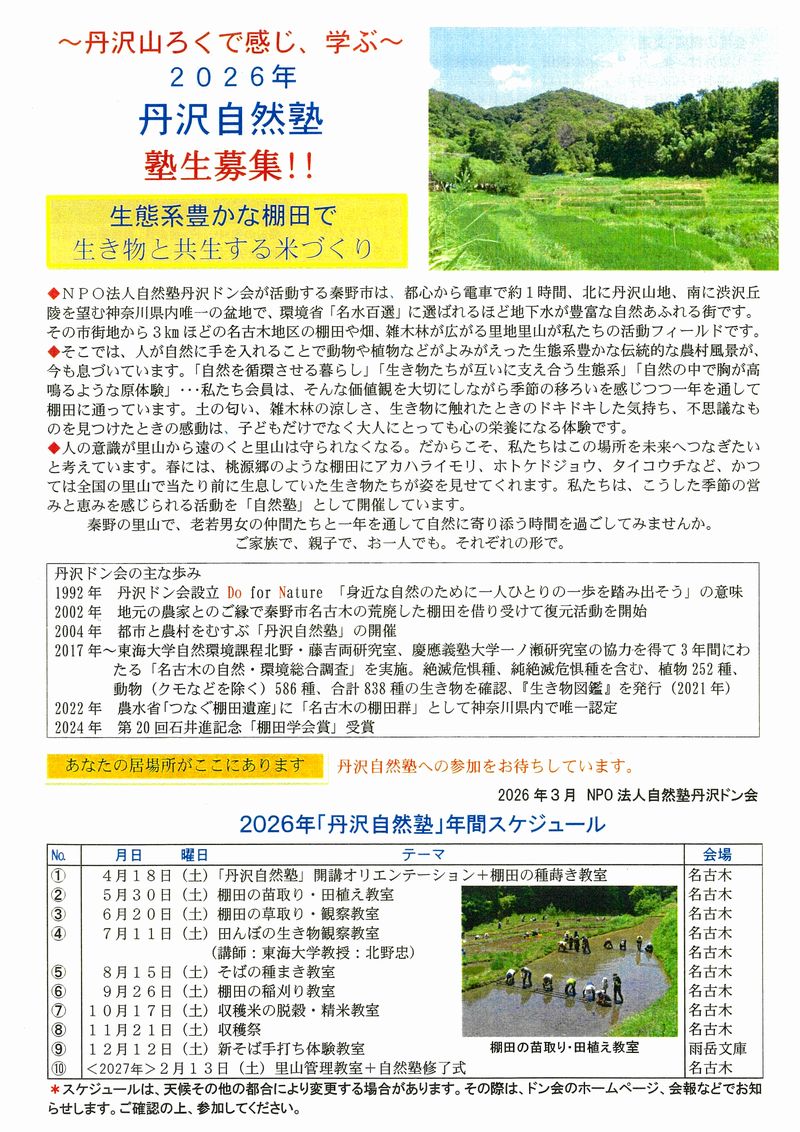 自然と人々の営みが豊かに息づく丹沢山麓にある棚田で活動するNPO法人 自然塾 丹沢ドン会が、「2025年丹沢自然塾」の塾生を募集しています。