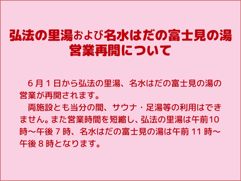 6月1日から弘法の里湯、名水はだの富士見の湯の営業が再開されます。・・・
