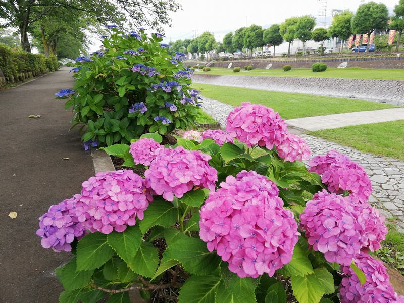 カルチャーパーク近くの水無川沿いのアジサイが見頃です。ソメイヨシノの木陰で、色とりどりの大輪の花を咲・・・