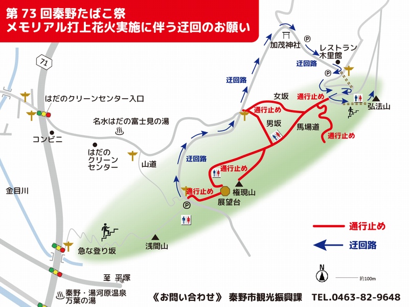 第73回秦野たばこ祭メモリアル打上花火の準備及び実施のため、弘法山公園内の上記ハイキングコースは11・・・