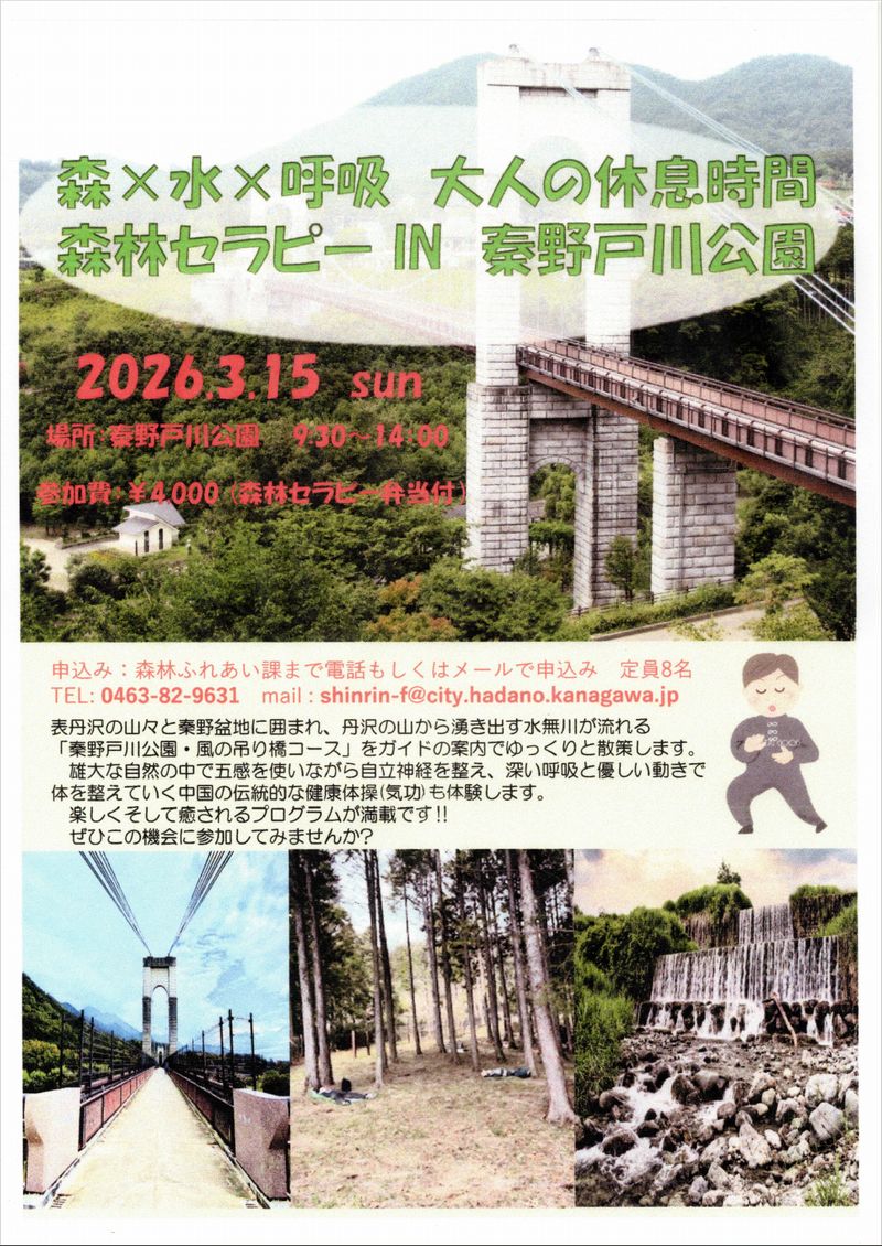 3/15(日)開催!森林セラピー『秦野戸川公園・風の吊り橋コース』早春の森に包まれる森林セラピーウォーク!~参加者募集!