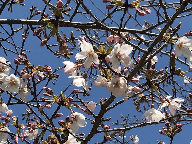 快晴の青空の下、弘法山公園の桜は五分咲きになっています。