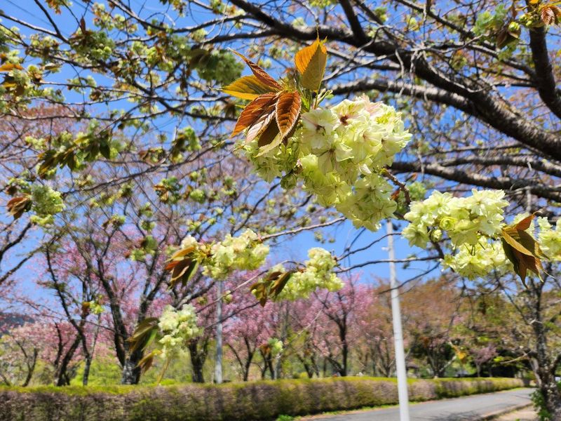 八重桜は公園内の諏訪丸駐車場近く、山岳スポーツセンター前、大倉バス停付近などにあります。