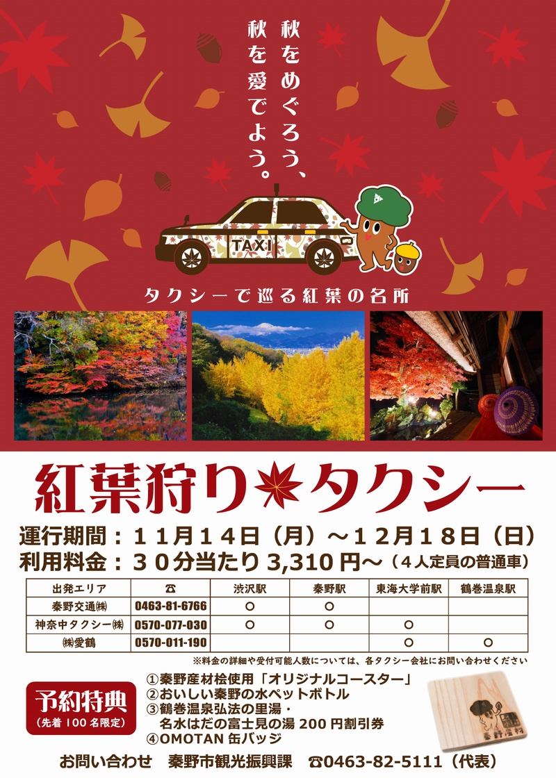 タクシーで気軽に、秦野の秋をめぐり、秋を愛でることができる特別企画です。